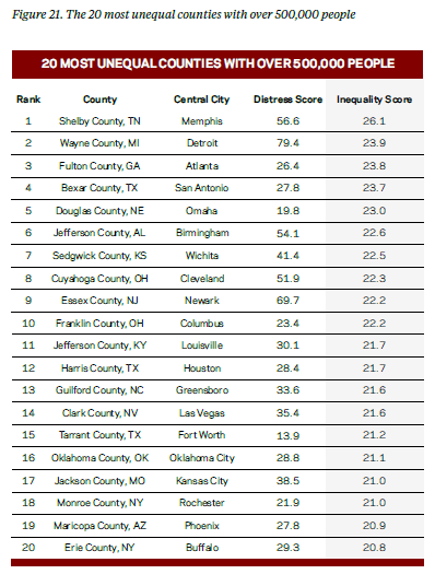 The next table shows the top 20 most unequal counties in the U.S. This list mostly consists of Southern counties that include cities like Atlanta, Birmingham, Houston, and Fort Worth, as well as those in Rustbelt cities like Detroit, Cleveland, and Columbus, Ohio.